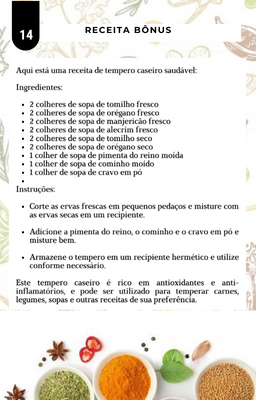 Neste e-book, vou ensinar como criar um tempero base artesanal que vai deixar suas receitas saborosas e saudáveis. Na minha cozinha, usamos este tipo de tempero para dar um sabor diferenciado a tudo o que preparamos.